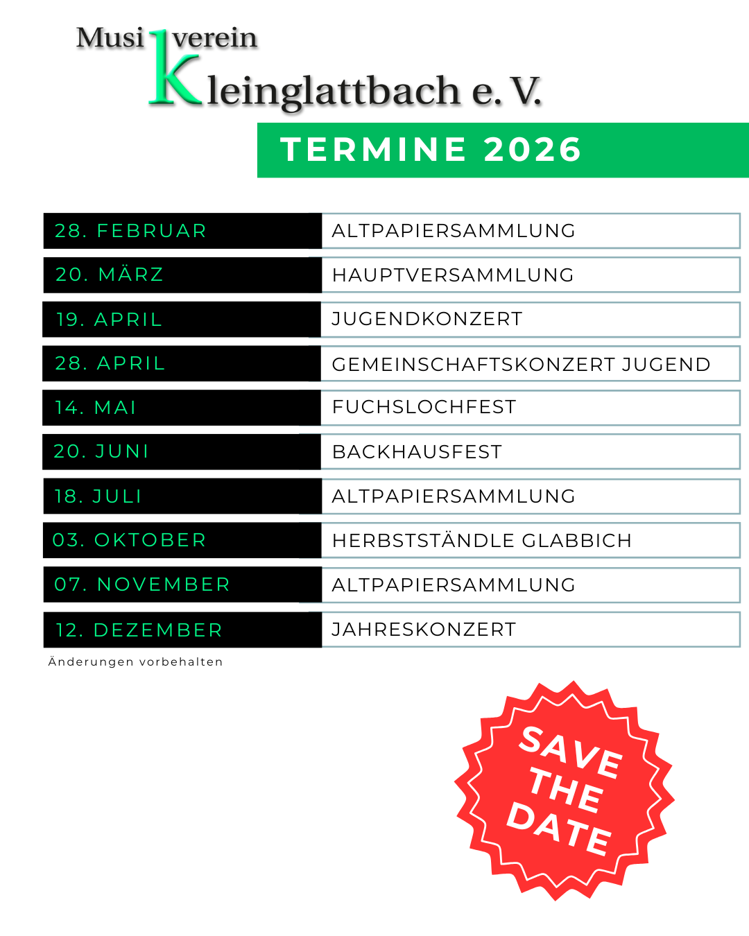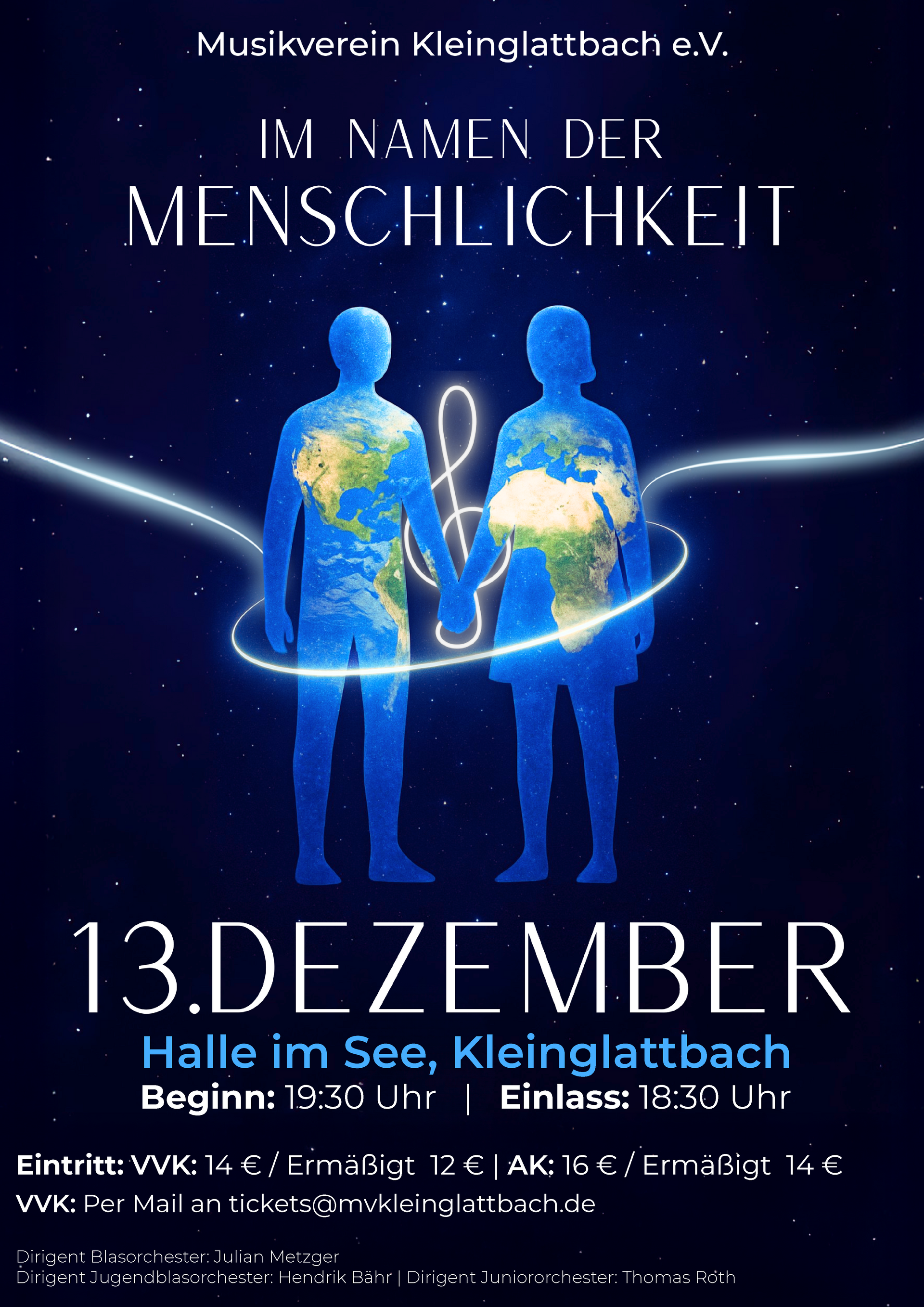 Der Musikverein Kleinglattbach lädt am Samstag, den 13. Dezember 2025 , herzlich zum diesjährigen Jahreskonzert unter dem Motto „Im Namen der Menschlichkeit“ ein. Einlass ist um 18.30 Uhr, Konzertbeginn um 19.30 Uhr. Besonders wichtig: Der Veranstaltungsort hat sich in diesem Jahr geändert. Das Konzert findet in der Halle im See in Kleinglattbach statt. Besucherinnen und Besucher werden gebeten, diesen geänderten Veranstaltungsort bei ihrer Planung zu beachten. Das Programm widmet sich Themen wie Mut, Freiheit, Mitgefühl und dem Schutz unserer Erde. Die Musik erzählt von legendären Helden, vom Leuchten der Sterne, vom Streben nach Frieden und von der Verantwortung gegenüber unserem Planeten. Das Publikum darf sich auf einen abwechslungsreichen und berührenden Konzertabend freuen. Eintritt und Vorverkauf Vorverkauf: Regulär 14 € | Ermäßigt 12 € Abendkasse: Regulär 16 € | Ermäßigt 14 € VVK: Bitte schreiben Sie uns eine mail an tickets@mvkleinglattbach.de. Geben Sie in der Mail bitte die Anzahl der Eintrittskarten pro Preiskategorie an. Sie erhalten anschließend eine E-Mail mit allen weiteren Informationen zur Bezahlung. Ermäßigung gilt für Personen unter 18 Jahren, Schüler, Studierende und Schwerbehinderte. Der Musikverein Kleinglattbach freut sich auf zahlreiche Besucherinnen und Besucher und auf ein musikalisches Jahreskonzert unter dem Motto „Im Namen der Menschlichkeit“.