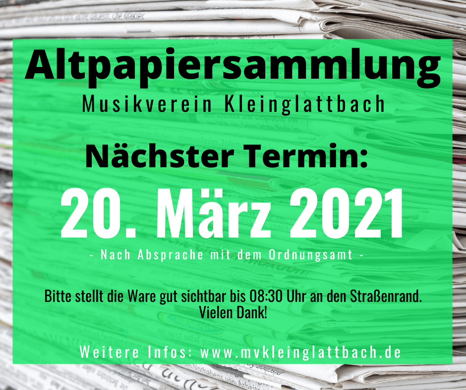 Am Samstag, 20. März 2021 findet nach Absprache mit dem Ordnungsamt unsere erste Altpapiersammlung in diesem Jahr statt.