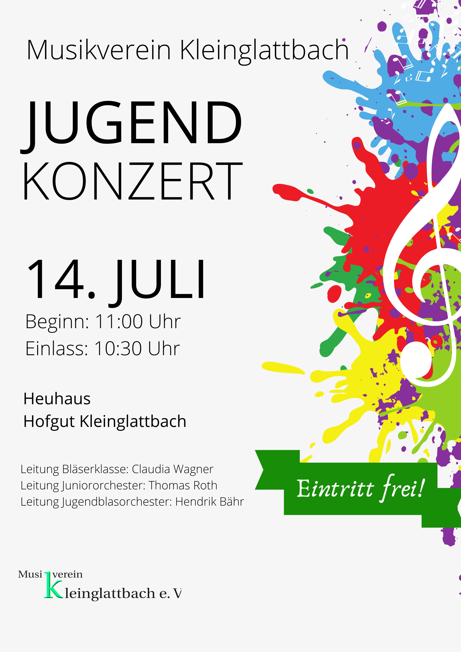 Unser Jugendkonzert findet am 14. Juli im Heuhaus auf dem Hofgut Kleinglattbach statt.