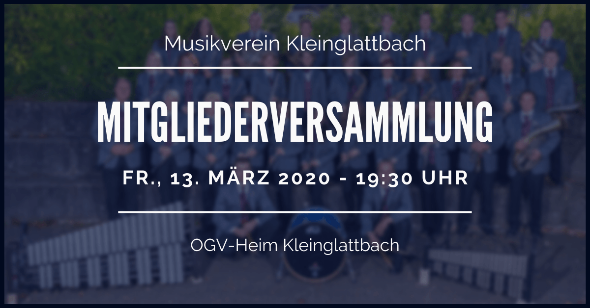 Unsere Mitgliederversammlung findet am Fr., 13.03.2020 um 19:30 Uhr im OGV-Heim (Im See 9, 71665 Vaihingen/Enz, bei der Halle im See) in Kleinglattbach statt. Wir laden alle aktiven und passiven Mitglieder, Jungmusiker und deren Eltern sowie Freunde des Vereins herzlich ein.