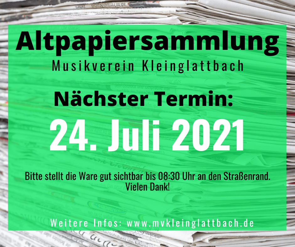 Am Samstag, 24. Juli 2021 findet unsere nächste Altpapiersammlung statt. Gesammelt werden Zeitungen, Illustrierte, Magazine, Kataloge, Kartonagen, Drucksachen, Bücher, Büro-und Schreibpapier. Harte Einbände bitte abtrennen und separat mit den Kartonagen sammeln, sowie bitte die Folienverpackungen entfernen.